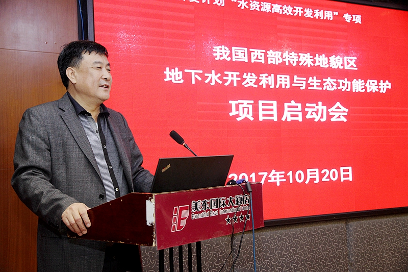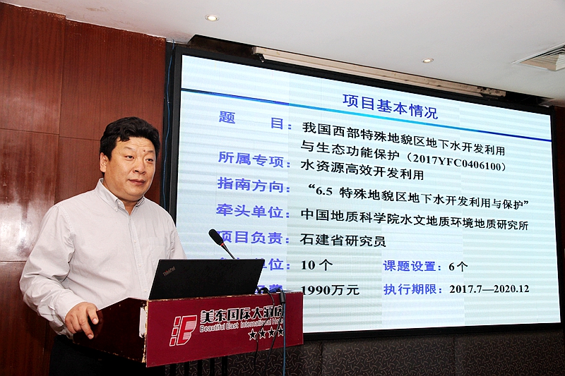 项目负责人、水环所所长、党委书记石建省研究员代表牵头单位致辞,他指出,该项目的实施是在新时代、新形势、新要求下,科技创新解决重大应用问题的具体实践。党的十九大提出了习近平新时代中国特色社会主义思想,人与自然和谐共生作为新时代坚持和发展中国特色社会主义的14条基本方略重要组成部分,就是要坚定走生产发展、生活富裕、生态良好的文明发展道路,建设美丽中国,为人民创造良好生产生活环境,该项目的实施正是对贯彻落实党的十九大精神的具体体现。要深刻把握科学研究既要体现多学科交叉,又要体现自然科学与社会科学相融合,这种新时代科技创新解决重现实大问题的新方式,在新时代、新要求的指引下,以强烈的责任心、事业心,提高站位,刻苦钻研,为西部地下水利用与生态保护协调发展做出积极贡献。同时,各课题之间要体现项目的整体目标,协调推进,相互印证,相互支持,加强项目管理,争取更多资源,加大配套经费支持,取得突出创新成果。