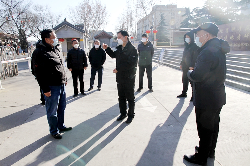 2020年2月18日,自然资源部中国地质调查局水文地质环境地质研究所党委书记石建省、纪委书记李援生带领疫情防控办相关负责人对石家庄、正定基地大院疫情防控情况进行在督导、再检查。