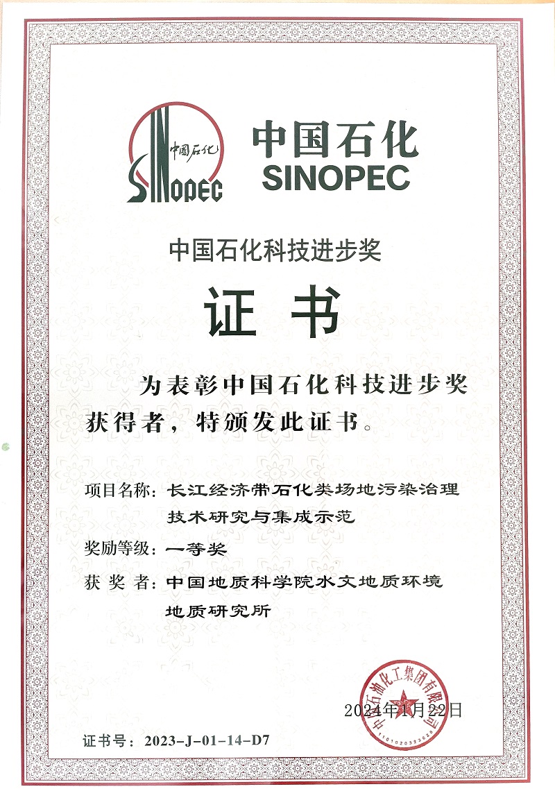 中国地质科学水文地质环境地质研究所承担了国家重点研发计划课题“石化场地污染土壤环境风险评价与预警研究”及两个子课题(2018-2022年),项目中水环所张敏研究团队充分发挥水文地质专业优势,解决了长江经济带“地表水-地下水频繁交互条件下石化特征污染物跨介质传输机制”重大科学问题,首次提出了四类石化污染水文地质概念模型,研发了具有自主知识产权的土壤和地下水污染源(区)羽微扰动、高精度刻画-解析技术体系,首创了在产企业场地污染“三界面四风险”预警-“自然衰减+”防控模式,提供了场地污染防治的新视角,为破解长江经济带“化工围江”困局提供了强有力的技术支撑,上述研究作为项目标志性成果,喜获中国石化科技进步一等奖。