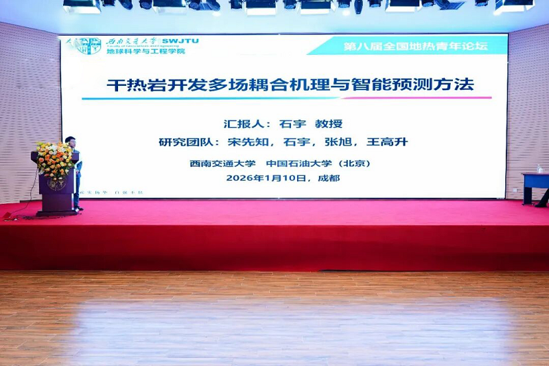 2026年1月10日,以“地热未来发展的无限可能”为主题的第八届全国地热青年论坛在西南交通大学隆重举办。本次大会旨在为地热能领域的青年学者和研究生搭建一个高水平的学术交流与成果展示平台,吸引了地热行业众多专家的共同关注。本届论坛设大会特邀报告、专题报告、研究生报告及技术展览等内容,国内地热领域的科研院校及相关企事业单位青年地热工作者齐聚一堂,进行广泛交流、深入探讨,并展示地热领域的最新研究成果与发展趋势。