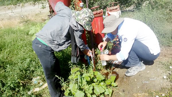 八月的新疆烈日当空,骄阳似火,温高达41度,地表温度最高达70多度。由项目负责人陈宗宇研究员率领的“我国跨界含水层水文地质调查”项目组一行18人分成5个小分队正奋战在新疆塔城田间地头,开展地下水取样、测试、调查工作。