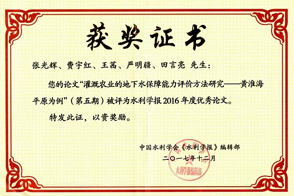 近日,我国水科学领域顶级学术期刊《水利学报》公布了历经一年的推荐、评选和公示的“2016年度《水利学报》十大优秀论文”,中国地质科学院水文地质环境地质研究所张光辉科研团队发表的“灌溉农业的地下水保障能力评价方法研究-黄淮海平原为例”入选“十大优秀论文”。