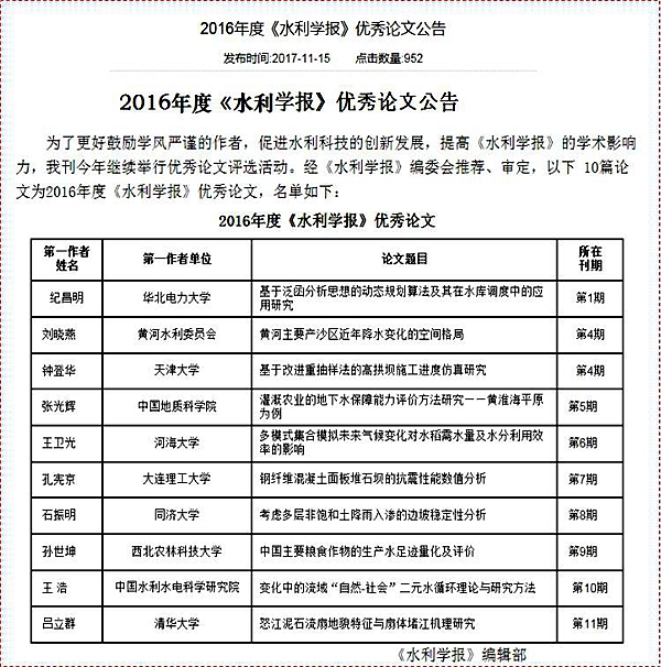 该十大优秀论文是从2016年度《水利学报》刊发的12期、177篇论文中评选出的,包括天津大学钟登华院士的“基于改进重抽样法的高拱坝施工进度仿真研究”、中国水利水电科学研究院王浩院士的“变化中的流域‘自然-社会’二元水循环理论与研究方法”、清华大学吕立群教授的“怒江泥石流扇地貌特征与扇体堵江机理研究”和河海大学王卫光教授的“多模式集合模拟未来气候变化对水稻需水量及水分利用效率的影响”等论文。