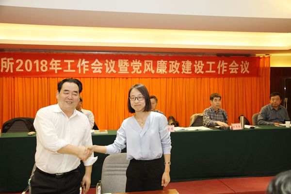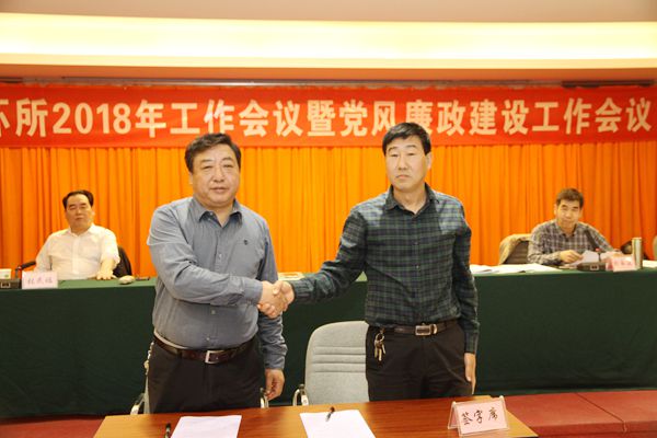 会上,所长石建省与所属部门签订2018年度保密、安全生产、社会治安综合治理、廉政建设目标责任书,副所长张兆吉宣读《关于2017年度职工和处室考核结果的通报》,副所长李援生宣读《关于2017年度获得上级和地方表彰奖励的情况通报》、《关于表彰2017年度工会先进集体和个人的通知》,纪委书记张民福宣读《关于表彰2017年度先进党支部 优秀共产党员 优秀党务工作者的通报》、《关于表彰第五届正风正气星情况的通报》。