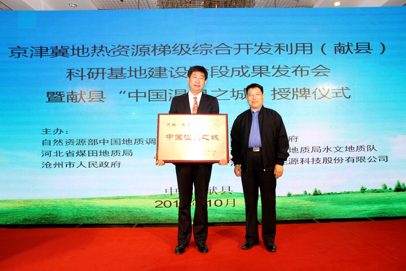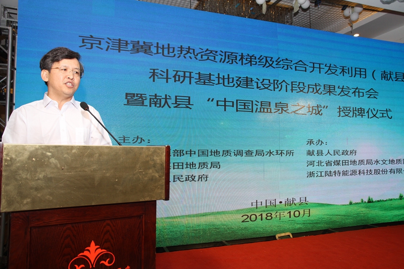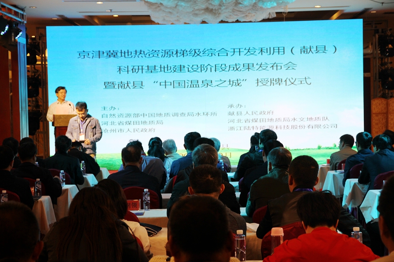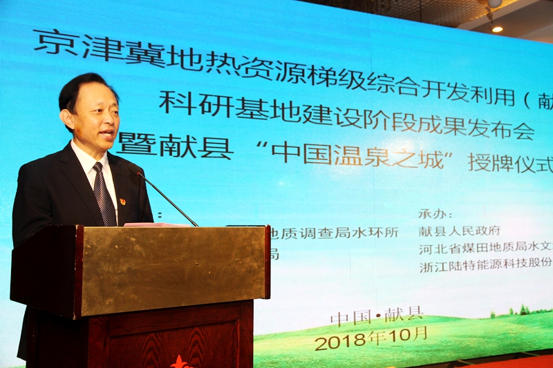 在自然资源部中国地质调查局指导下,2018年10月9日,由自然资源部中国地质调查局中国地质科学院水文地质环境地质研究所、河北省煤田地质局、沧州市人民政府主办,献县人民政府、河北省煤田地质局水文地质队、浙江陆特能源科技股份有限公司承办的京津冀地热资源梯级综合开发利用(献县)科研基地阶段成果发布暨学术研讨会在献县举行。