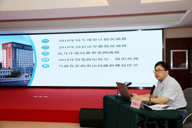 本次培训工作开展了两项活动,一是邀请所党委书记、所长石建省同志以“深刻认识主动推进三大转变,筑牢风险防控防线”为题,从“提高政治站位、主动服务需求、落实三大转变、筑牢风险防线”等四个方面为参训同志作了一次生动、深刻的主题党课教育;二是邀请所监察审计处处长宋瑞京同志作“明职责、守底线、敢担当,尽心尽力做好本职工作”主题培训,从“地调局2018年廉政风险防控专项审计发现的问题、局廉政风险情况通报、目前应当高度重视的突出问题和薄弱环节、增强党员干部抗腐防变能力、2019年所监察审计重点工作”等方面为参训的党员干部职工作了一次生动的廉政风险警示教育。