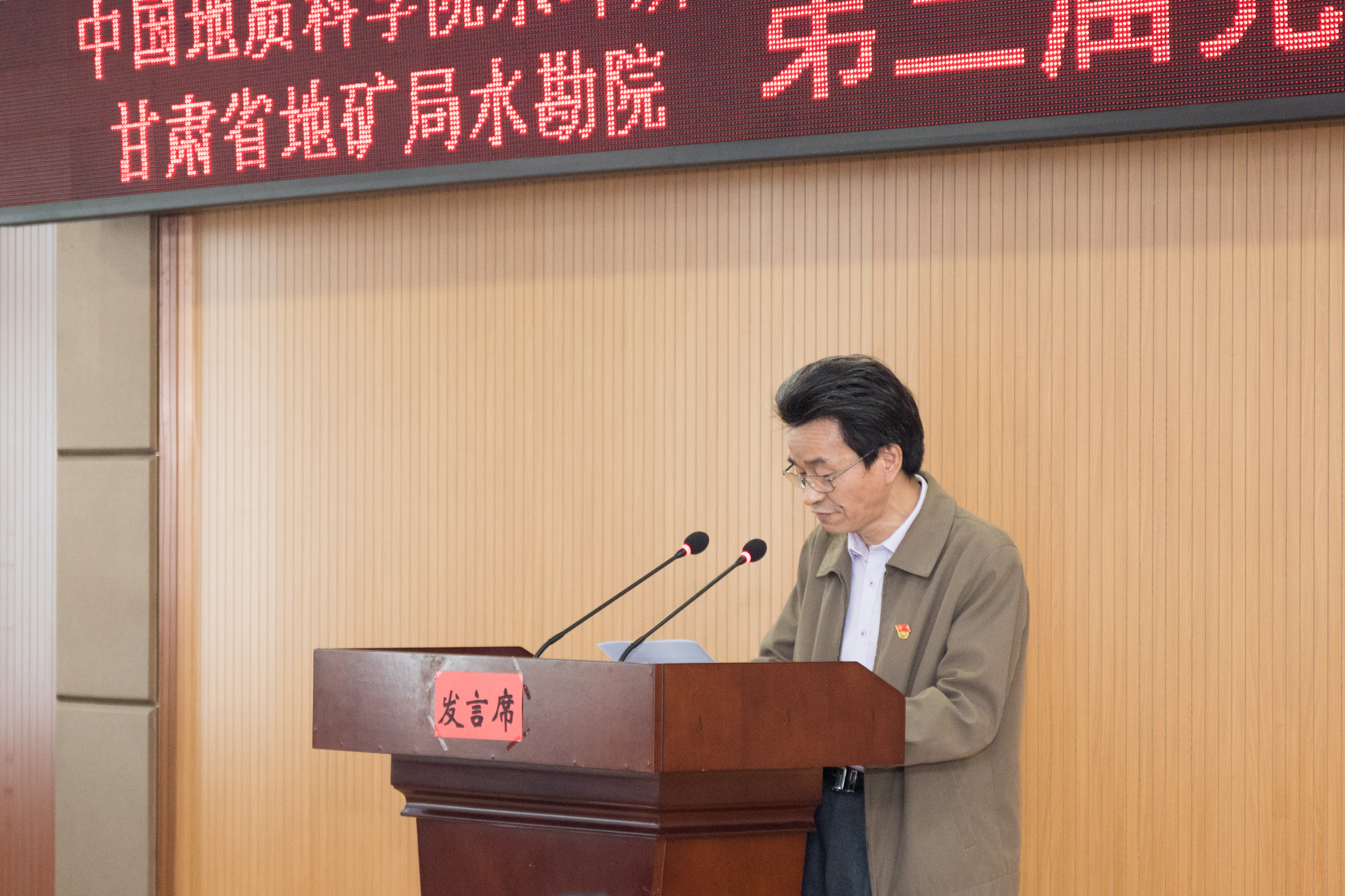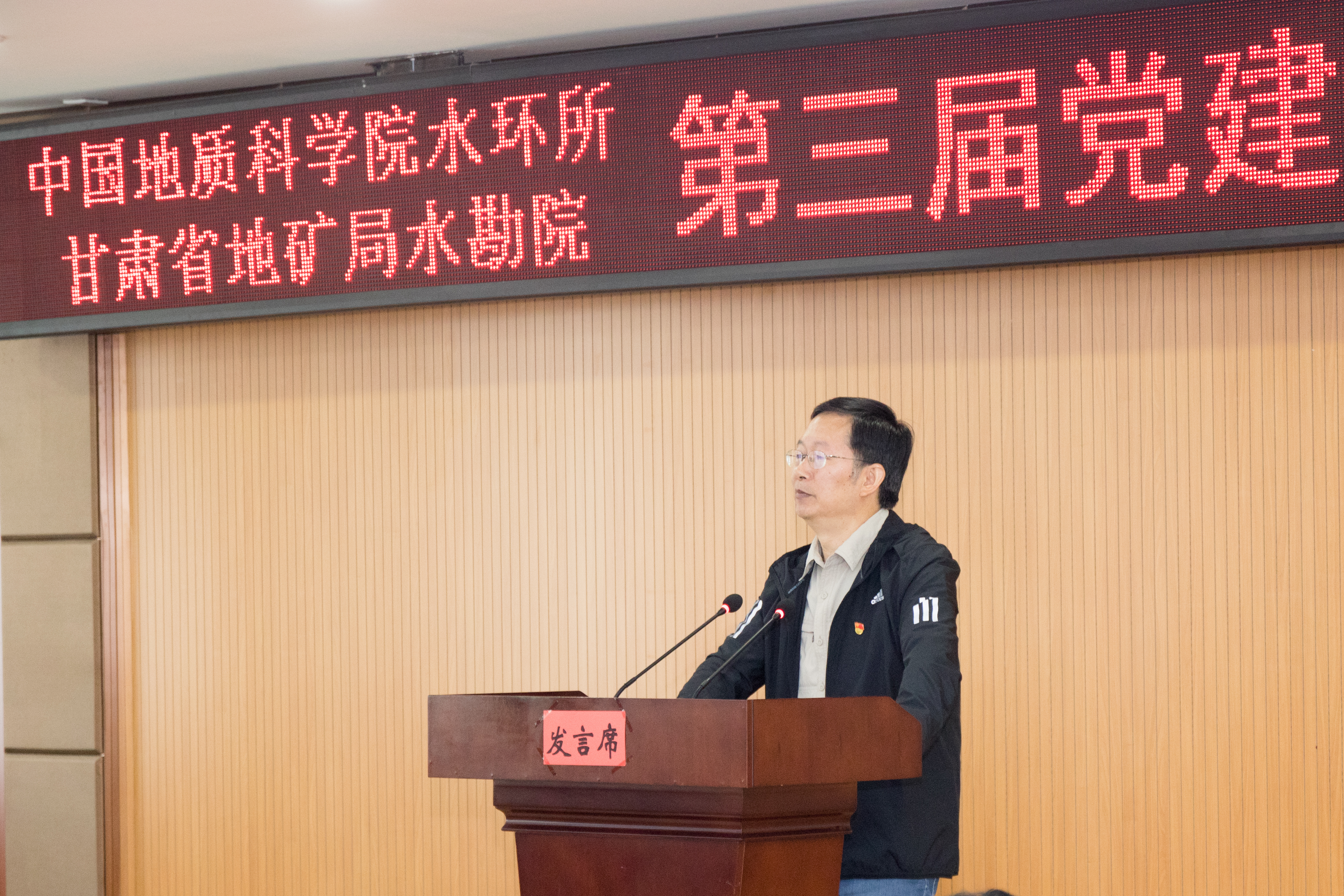 石建省在致辞时指出,水环所与甘肃省水勘院有多年很好的合作基础,在长期的合作过程中,优势互补、共同进步,携手做出了许多有影响的重大成果。2016年共建以来,双方以党建和精神文明建设为平台,以共商、共建、共享、共赢为宗旨,以西部生态脆弱区生态文明建设为重点,开展扎实共建,成果十分喜人。当前,我国地质工作正经历大变革、大调整,地质工作正从以支撑服务矿产资源管理为主向以支撑服务包括矿产资源在内的自然资源管理转变,这些对水工环地质工作提出新的更高要求,双方合作空间潜力巨大,携手推进西北地区生态文明建设大有可为、大有作为。下一步,我们要在专家经常互访、项目联合申报、人才联合培养、技术联合攻关、成果相互分享、党建和管理相互借鉴等方面进一步深化合作,全力以赴为落实全面从严治党向基层延伸要求、打造央地地质合作新典范做出新的更大的贡献!