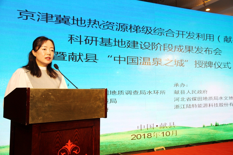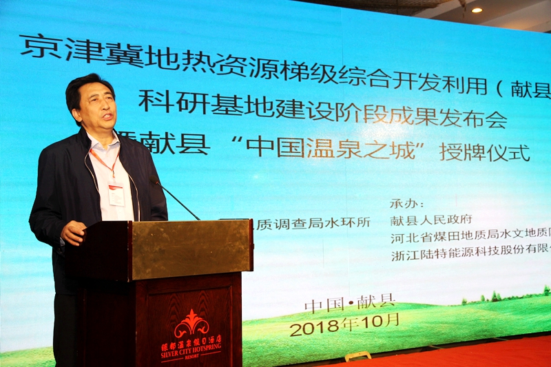 在自然资源部中国地质调查局指导下,2018年10月9日,由自然资源部中国地质调查局中国地质科学院水文地质环境地质研究所、河北省煤田地质局、沧州市人民政府主办,献县人民政府、河北省煤田地质局水文地质队、浙江陆特能源科技股份有限公司承办的京津冀地热资源梯级综合开发利用(献县)科研基地阶段成果发布暨学术研讨会在献县举行。